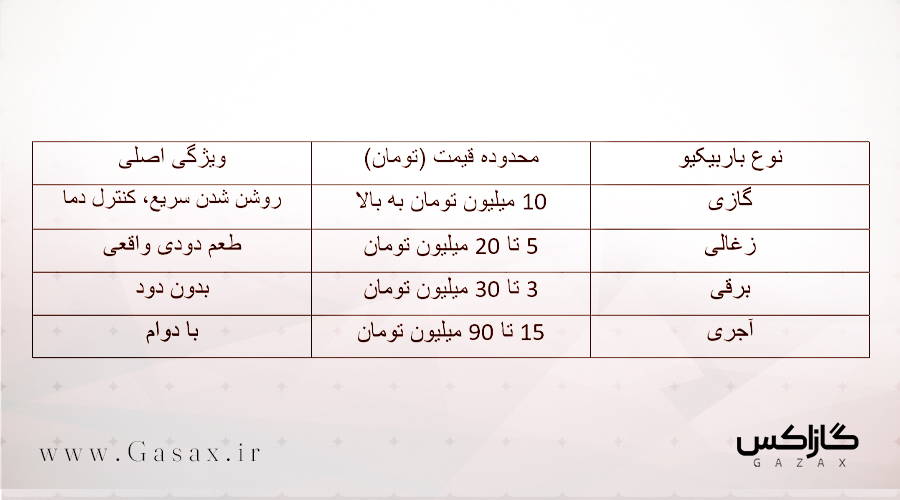 قبل از خرید باربیکیو، بهتر است با انواع آن آشنا شوی. هر مدل کاربرد و قیمت متفاوتی دارد: